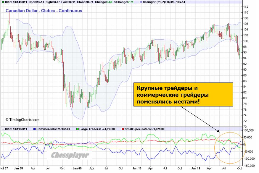 Во-первых: крупные трейдеры и коммерческие трейдеры поменялись местами. Теперь крупные трейдеры занимают короткую позицию в канадском долларе, а коммерческие длинную.