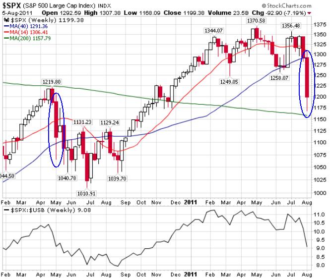 Индекс S&P500 подошел к 200-периодной недельной скользящей и к той точке, в которой он встречал объявление о QE2.