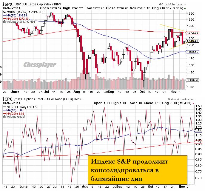 Во вторник фондовые индексы на Уолл-стрит завершили торги в зеленой зоне в основном за счет позитивной макростатистики. Министерство торговли США сообщило, что в октябре объем розничных продаж вырос на 0,5% против прогноза повышения на 0,3%. Также в октябре индекс цен производителей (PPI) снизился на -0,3% против +0,8% в сентябре. По идее, снижение инфляционного давления дает возможность ФРС начать действие стимулирующих программ поддержки экономики, если это потребуется. Наконец, индекс Empire State Manufacturing в ноябре вырос до +0,61 п. против -8,48 месяцем ранее. Рост на заокеанских фондовых рынках был бы еще больше, если на инвесторов не давили проблемы нестабильности долгового рынка Европы, где вчера доходность итальянских 10-летних бондов опять выросла до отметки в 7,07%.