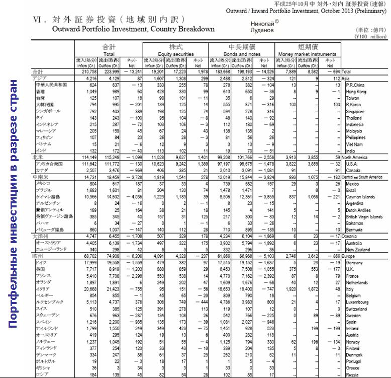 Вторая таблица: портфельные инвестиции нерезидентов в Японии с апреля по октябрь 2013 г.