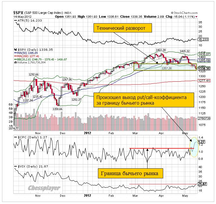 Put/call – коэффициент отражает результат вчерашних торгов и имеет четкие медвежьи характеристики; так же как и картина на графике S&P500