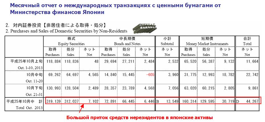 Мы видим, что общий приток средств нерезидентов за октябрь составил примерно 4,427 трлн. йен (больше 45 млрд. долларов). Из них 3,07 трлн. йен приходилось на инструменты денежного рынка, т.е. кэш.