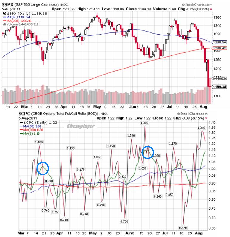 Это уже биржевая паника. Индекс пессимизма зашкаливает все пределы. Put/call коэффициент достиг вчера 1.36, а его 9-дневная скользящая средняя равна 1.19. Пик этого индикатора является хорошим индикатором разворота.