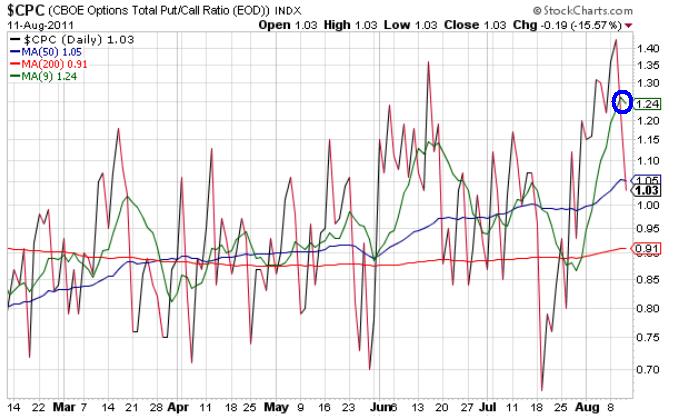 А что показывают наш экзотический индикатор разворота – 9-дневная средняя скользящая put/call коэффициента?