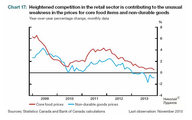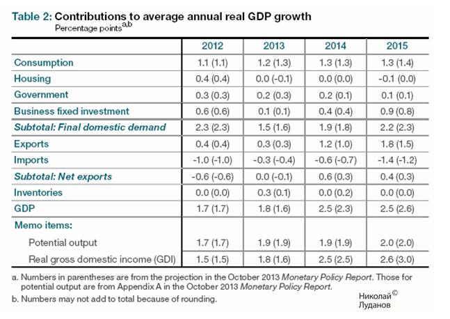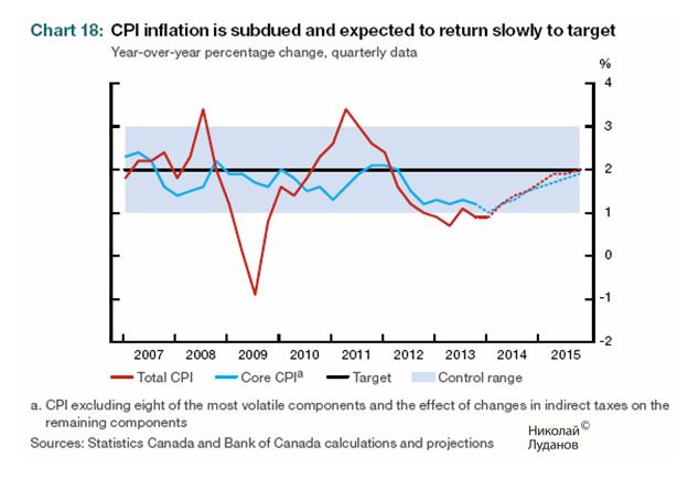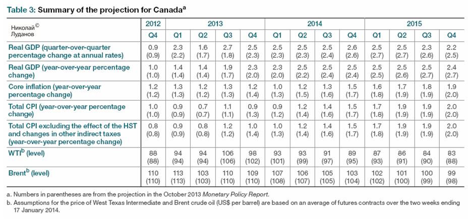 В следующей таблице показаны суммарные проекции по Канаде на ближайшие 2 года. Банк Канады ожидает, что в 1 квартале 2014 года инфляция достигнет минимального значения, а затем начнет расти. Банк понизил прогнозы по сравнению с прошлым докладом по монетаной политике (указаны в скобках).