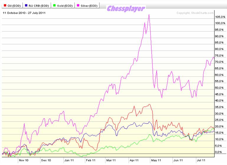 На следующем графике показаны основные commodities: золото, серебро, нефть и индекс оптовых цен CRB с октября 2010 года.