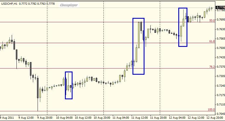 На рисунке внизу показаны момент выхода пресс-релиза и валютные интервенции SNB: они хорошо видны на графиках.