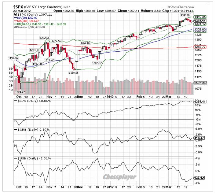 Ралли продолжается слишком долго и зашло слишком далеко (в %). Акции стоят дорого по сравнению с облигациями и commodities – уже не раз приводил график S&P500, индекса CRB и цен на 30y US bonds.