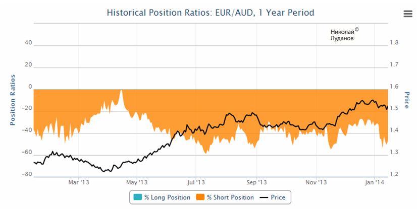 Стоит отметить, что в последнее время изменилась прежняя тенденция: теперь при росте EUROAUD чистый шорт ритейла уменьшается.