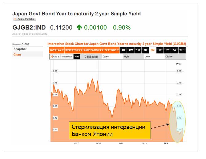 На рисунке внизу показана доходность двухлетних государственных облигаций Японии – основной, так сказать, «объект» стерилизации. Разворот доходности вверх показывает, что появилась потребность в JPY.