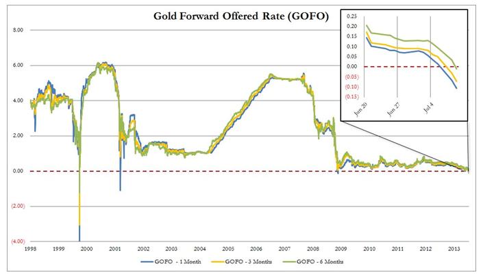Zero Hedge пишет о том, что 1 Month Gold Forward Offered (GOFO) перешли в отрицательную зону впервые с ноября 2008 года - сразу после банкротства Лемана. GOFO (Gold Forward Offered Rate) – это форвардные ставки по золоту. Это ставки, по которым контрагенты готовы предоставлять золото взамен на американские доллары. Ставки котируются для 1-месячного, 2-хмесячного, 3-хмесячного и 12-месячного периода. Перемещение GOFO в отрицательную территорию означает, что золото с будущей поставкой торгуется с дисконтом относительно цен на физическое золото. Это очень редкая ситуация, которая случалась всего несколько раз за последние 20 лет. Приводятся следующие возможные причины этого явления: