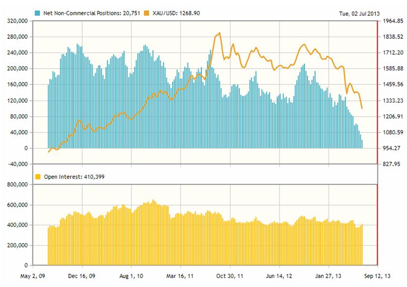 В любом случае ситуация аномальная и чревата крупным шортсквизом со стороны хеджфондов, занимающих короткие позиции по золоту. Многие крупные инвесторы, в том числе Джим Роджерс, считают, что золото торгуется вблизи дна. Однако при этом они предостерегают, что ситуация была столь драматична и продажи были столь беспрецедентны, что золото может еще упасть вплоть до 1000-1050 долларов за унцию. За последние 5 лет не было столь негативного сентимента по золоту, как сейчас. Диспозиция по золоту на CFTC согласно последнему отчету CFTC была следующая: Чистая позиция некоммерческих трейдеров составляла всего 20751. При том, что в среднем за последние четыре года чистая позиция этой группы составляла порядка 150 тыс. контрактов. Ситуацию здесь тоже можно оценить, как благоприятную для покупок. |