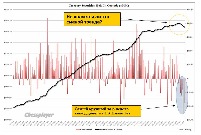 И неважно, какие за ним скрыты причины. Продажи USD-активов, как считает Zero Hedge, слишком низкая доходность или ответ Китая на антикитайский билль, принятый американским сенатом (эти две версии я ранее высказывал) или как теперь выясняется, возможно, заблаговременная подготовка фондов к ожидаемому положительному решению евросаммита и саммита двадцатки в Каннах, который состоится 3 ноября.