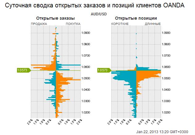 Рыночный сентимент по AUD Если на фьючерсном рынке большинство игроков стоят в лонге по AUD, то клиенты форексброкеров в основном стоят в шорте по AUD. В швейцарском форексброкере Dukascopy (SWFX) розничные клиенты имеют диспозицию по AUD ЛОНГ/ШОРТ=25,6/74,4. Точь-в точь такая же диспозиция в Saxobank. Достаточно серьезно отличается распределение в Оанде: ЛОНГ/ШОРТ=45,3/54,7. Взглянем более внимательно на диспозицию в Оанде. Оанда позволяет нам увидеть, как распределены позиции клиентов по ценовой шкале. И здесь мы видим интересную вещь. Если бы мы взяли позиции только в диапазоне 1,04-1,06 – это то, где AUDUSD торгуется большую часть времени с ноября, то количество лонгов здесь примерно такое же, как и шортов. Распределение 45,3/54,7 в пользу шорта возникло в основном за счет коротких позиций клиентов в диапазоне 1,00-1,04. Лонгов там практически нет. Возникает вопрос: может быть в SWFX и Saxobank большинство шортов располагаются в зоне глубокого убытка, и не отражают текущую активность рынка? Из этого можно сделать вывод, что общее соотношение ЛОНГ/ШОРТ не всегда дает объективную информацию о настроении розничных игроков, поскольку не учитывает распределение их по ценовой шкале. Компания Oanda в этом смысле дает нам наиболее полную информацию, и в последующем я буду пользоваться их данными. Резюме: распределение клиентских позиций у форексброкеров говорит в пользу лонга по AUD. |