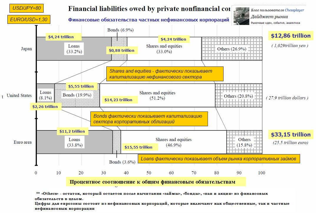 Если вы торгуете на валютном рынке в долгосрочном плане, и пытаетесь нарисовать в уме диспозицию активов, вам необходимо иметь представление об объемах основных финансовых рынков. Рисунок внизу дает информацию об объемах (капитализации) рынков займов, облигаций и акций Японии, США и еврозоны. В Японии финансирование компаний осуществляется в значительной степени за счет займов, а не привлечения инвесторов в капитал компаний. Стоимость акций составляет всего треть от пассивов компаний. Рынок займов, как известно, связан с рынком долговых обязательств. Полагаю, что нестабильность валютного курса JPY должна вызвать у японских корпораций осторожность при заимствовании. Ведь если все вернется на круги своя, и USD/JPY опять упадет до 78, то им придется возвращать больше капитала. Замечу также, что В Европе практически не существует рынка корпоративных облигаций. |