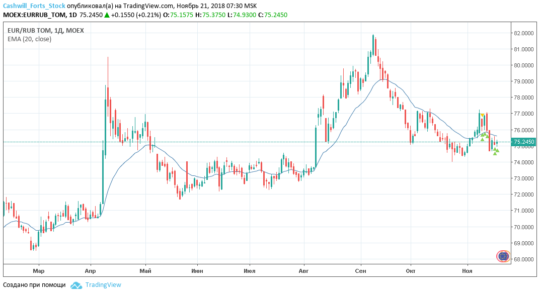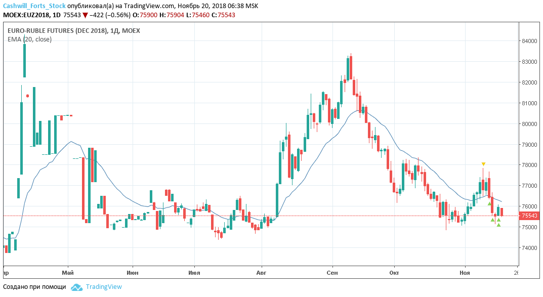 В понедельник фьючерс на евро/рубль ( EUZ2018 -0.66% ) продолжил консолидацию выше ключевого уровня поддержки 74832 в диапазоне долгосрочного восходящего тренда.