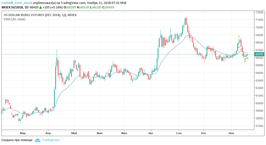 В понедельник фьючерс на доллар/рубль (MOEX:SIZ2018) продолжил консолидацию выше ключевого уровня поддержки 65367 в диапазоне долгосрочного восходящего тренда.