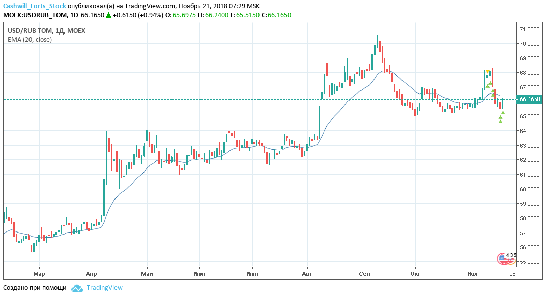 В понедельник валютная пара ( USDRUB_TOM -0.65% ) продолжила консолидацию выше ключевого уровня поддержки 64,90 в диапазоне долгосрочного восходящего тренда.