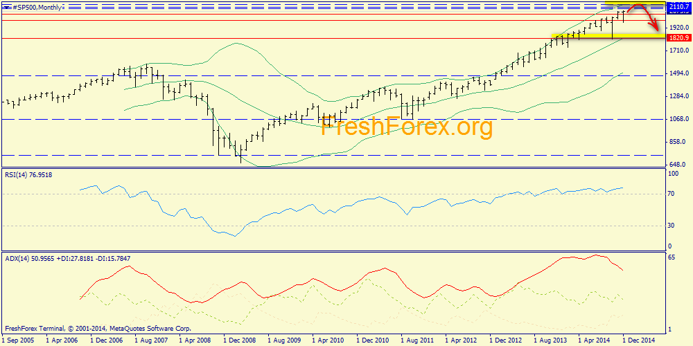 Месячный график: итак, мы видим, что получена достаточно сильная предразворотная комбинация связки ADX/RSI (противоход на растущем осцилляторе). Как правило, это означает, что быки производят бросок вверх, не имея под собой трендового динамита. Это делает возможным разворот индекса в зоне верхней полосы Боллинджера (2108.8). Поддержкой аптренда пока выступает средняя полоса (1792.0)