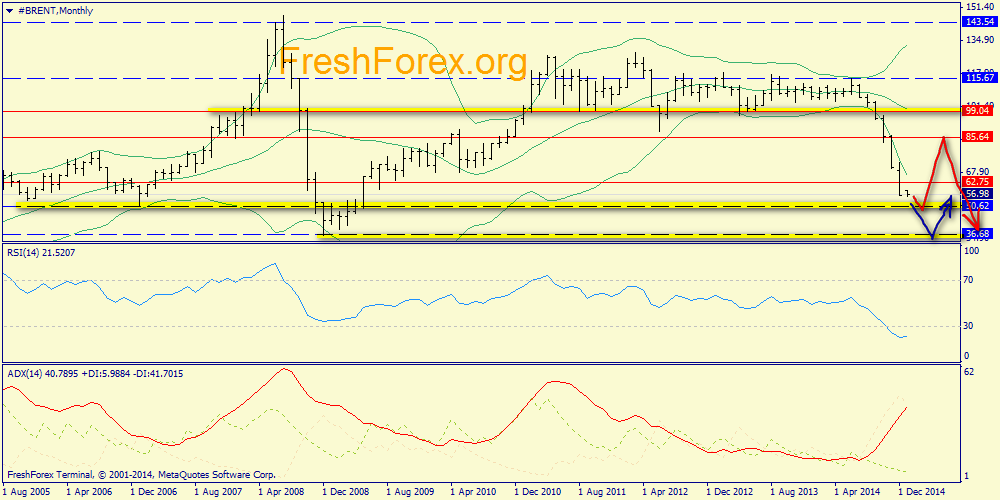 Месячный график: итак, ключевая поддержка 67.45. Если она не удержит нефть - то цена упадет к 51.87, а затем и к 35.00 (красная стрелка).