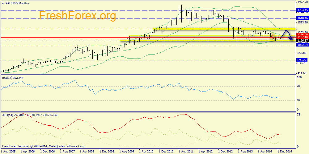 Недельный график: зафикисирован пробой нижнего конверта, поэтому, после нового минимума, можно будет ожидать откат в зону средней полосы (1269.00), откуда цена может пойти в атаку поддержки 1000.00.