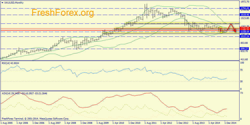 Месячный график: оправдывает себя поддержка 1155.54, поэтому возможен рост цены на золото в район 1331 доллар за унцию.