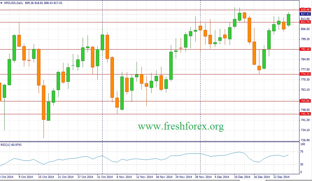 Новая торговая неделя будет укороченной в связи с празднованием Рождества и на этом фоне можно ожидать развития боковой тенденции по металлам платиновой группы. Релиз из Соединенных Штатов по объему заказов на товары долгосрочного пользования может поддержать спрос на платину и палладий, однако в период низкой ликвидности на сильный рост рассчитывать не приходится. На этом фоне платина (XPT/USD) в течение недели может протестировать отметку 1215, палладий (XPD/USD) уровень 814.