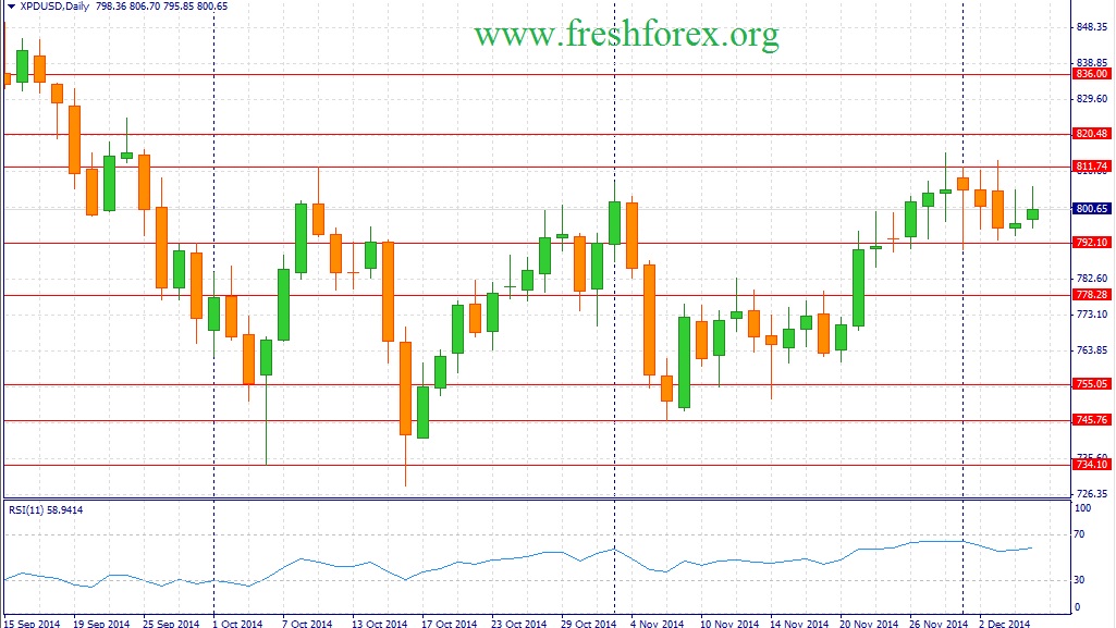 В новую пятидневку металлы платиновой группы продолжат торговаться в боковом тренде. Основные сырьевые активы сейчас находятся на достаточно низких уровнях и в этой связи трейдеры не будут наращивать короткие позиции. Мощный рост экономики Соединенных Штатов в последние 9 месяцев указывает на наличие устойчивого спроса на оба металла. На будущей неделе не ожидается публикации важной макроэкономической статистики, способной вызвать сильные изменения на товарном рынке. В этой связи следует ожидать развития боковой тенденции в следующих диапазонах: по платине (XPT/USD) 1190-1240, по палладию (XPD/USD) 790- 815.