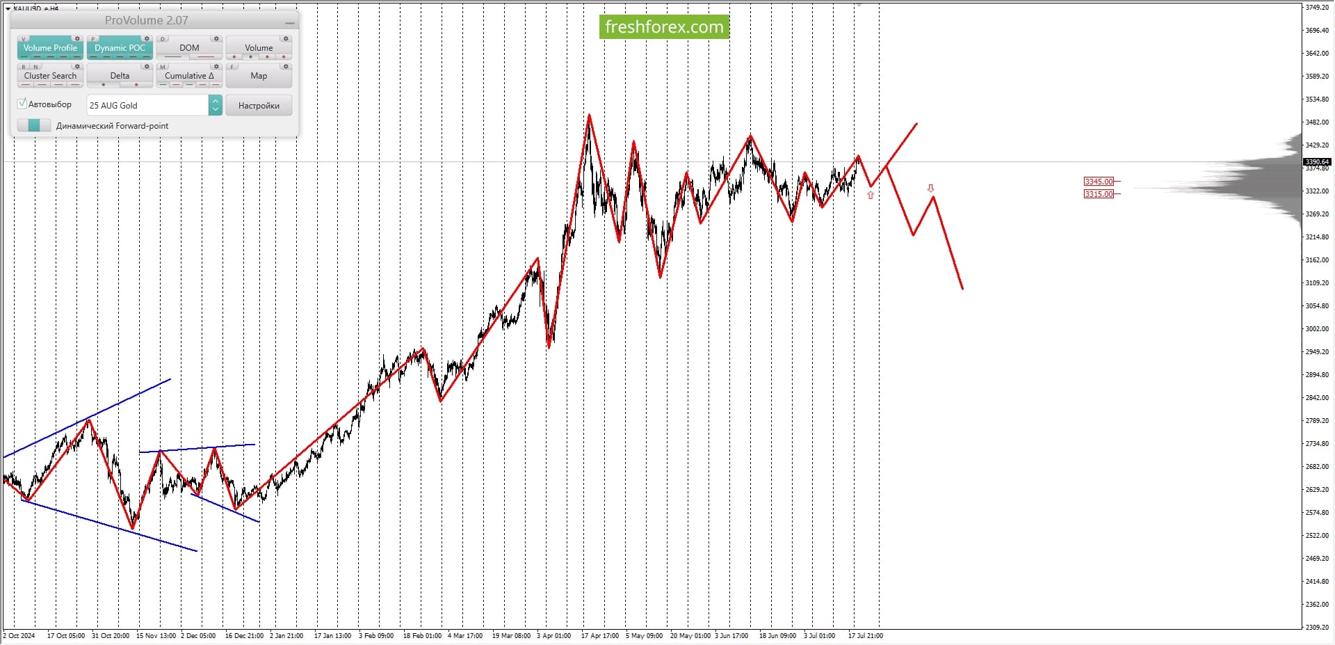 • Среднесрочная тенденция: в лонг. Максимальное скопление объемов среднесрочной тенденции расположено в диапазоне, по котировкам 3326.00-3334.00. В настоящий момент по XAUUSD совершаются инвестиционные операции выше указанного диапазона, что говорит о силе покупателей.