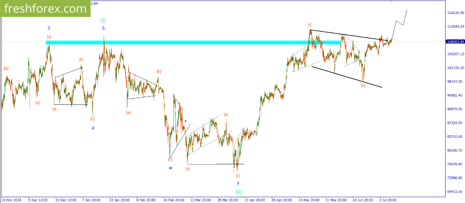 Волатильность на рассматриваемом торговом инструменте продолжает оставаться чрезвычайно низкой. Однако такое затишье, всегда происходит перед бурей. Сейчас, вероятно, завершилось формирование сходящегося горизонтального треугольника, являющегося четвертой волной импульса, формирующегося внутри волны 5.