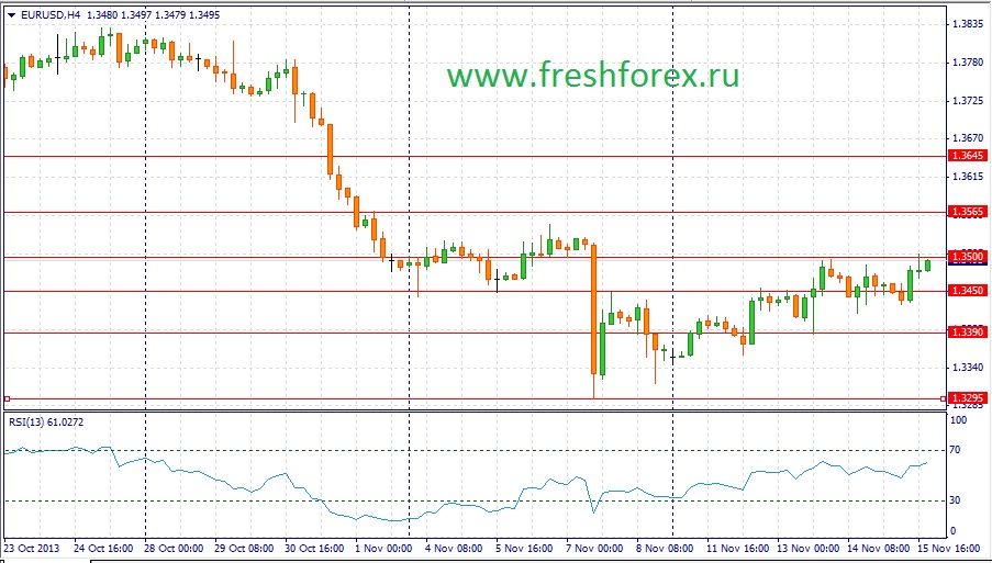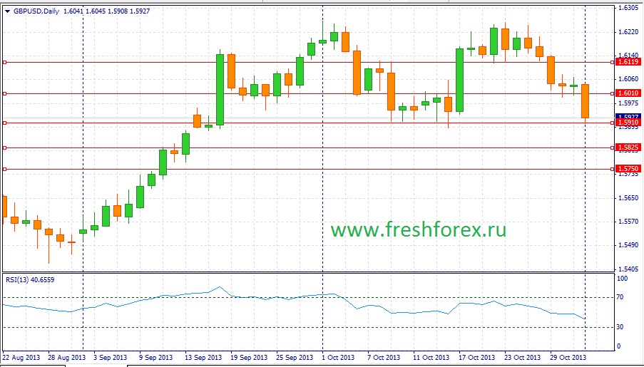 По британскому фунту следует выделить публикацию протоколов последнего заседания Банка Англии, которые будут опубликованы в среду 20 ноября. Участники рынка не ожидают сюрпризов в отношении денежно-кредитной политики. В своем ежеквартальном обзоре по инфляции, Банк Англии дал понять участникам рынка, что учетная ставка будет повышена только по достижению уровня безработицы в 7% (сейчас 7.6%). Для продолжения позитивной тенденции паре фунт/доллар необходимо закрепиться выше отметки 1.6133.