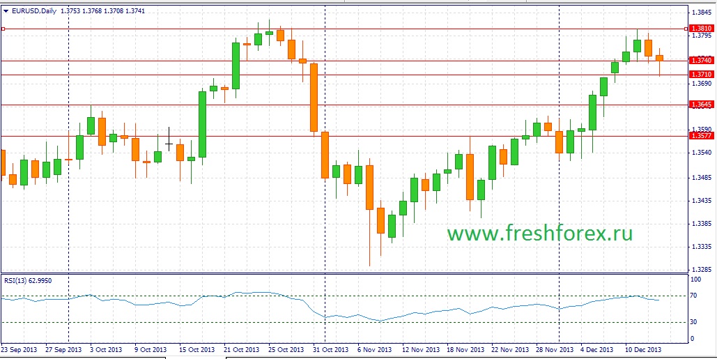 Прошедшая неделя на валютном рынке Forex была не очень богата на макроэкономическую статистику. Единая европейская валюта по итогам недели сумела немного укрепить свои позиции, несмотря на слабую статистику из Еврозоны. Промышленное производство в регионе сократилось на 1.1% в месячном выражении, что является худшим значением с октября 2012 года и указывает на проблемы европейского промышленного сектора. В четверг 12 декабря в Штатах был опубликован отчет по розничной торговле. Объем розничной торговли вырос на 0.7%, что говорит о хороших темпах роста американской экономики, поскольку расходы потребителей играют важную роль в ВВП США. Однако, укрепление американской валюты по отношению к своему основному конкуренту было умеренным и торговую неделю пара евро/доллар закрыла на отметке 1.3741.