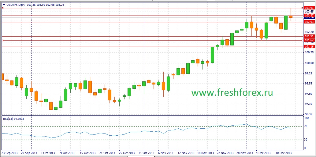 В последние торговой день минувшей недели состоялось заседание ЦБ Японии. Как и ожидали участники рынка – объем покупок облигаций остался на прежнем уровне. Регулятор заявил, что в случае необходимости готов корректировать свою денежно-кредитную политику. И можно ожидать, что такая необходимость может возникнуть в 2014 году, что будет способствовать дальнейшему ослаблению японской валюты.