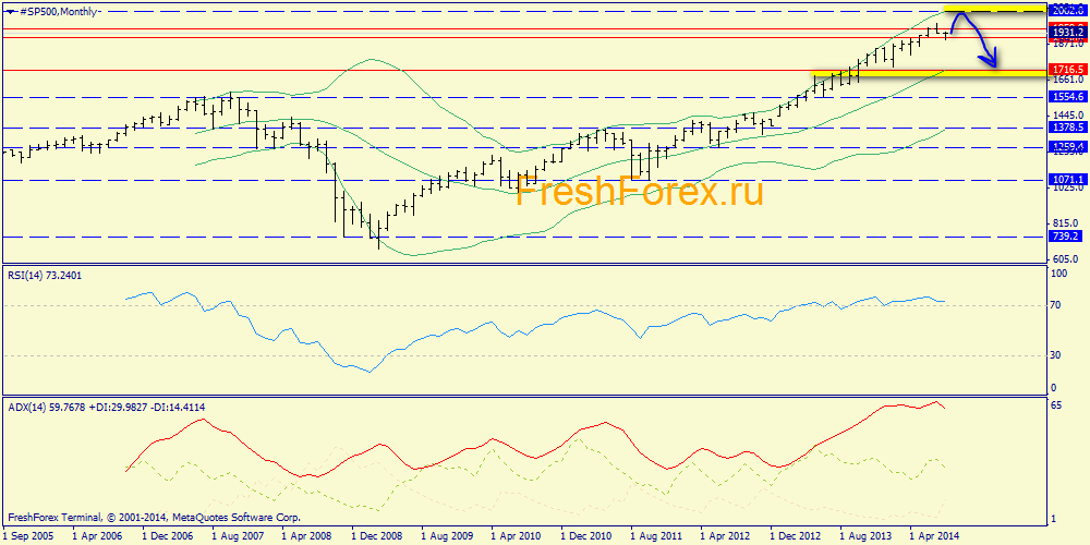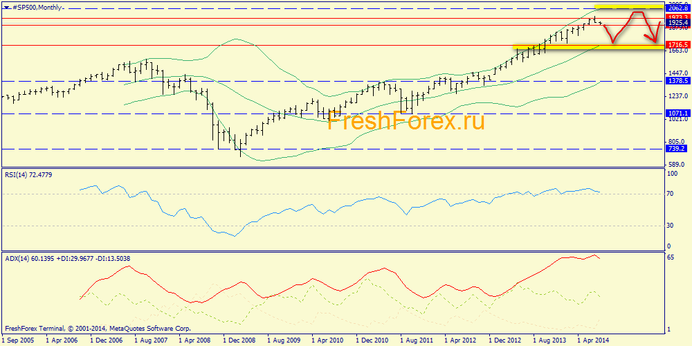 Месячный график: итак, мы видим, что начало коррекции положено. Очень серьезная перекупленность индекса, дивергенция - все это на руку медведям для полного слома аптренда.