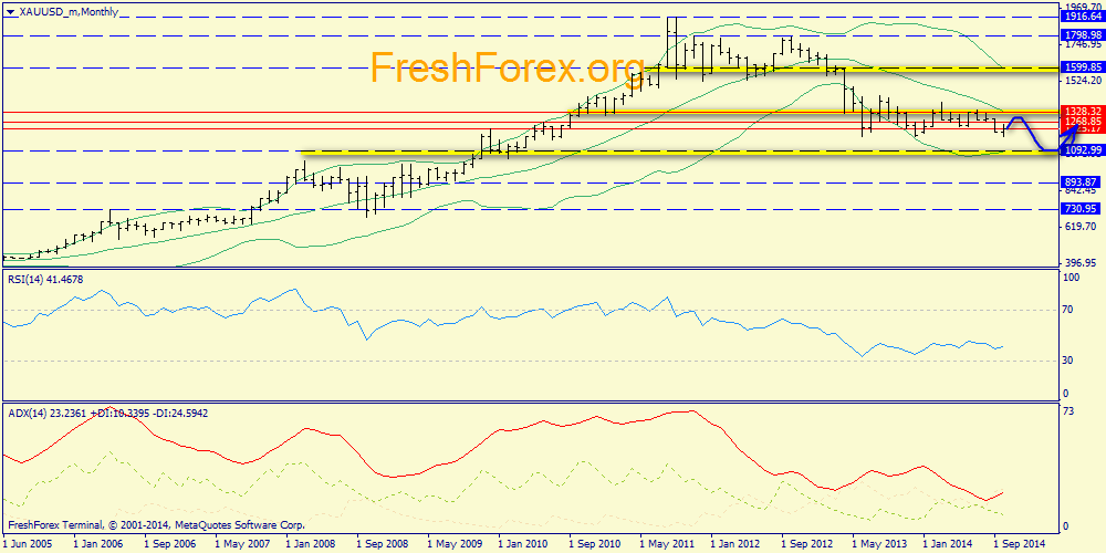 Месячный график: золото сохранило нисходящую тенденцию и направленность в зону 1093 (нижняя полоса Боллинджера). ADX не предрасположен к трендовой активности, поэтому ждем отскок в зону средней (1269).