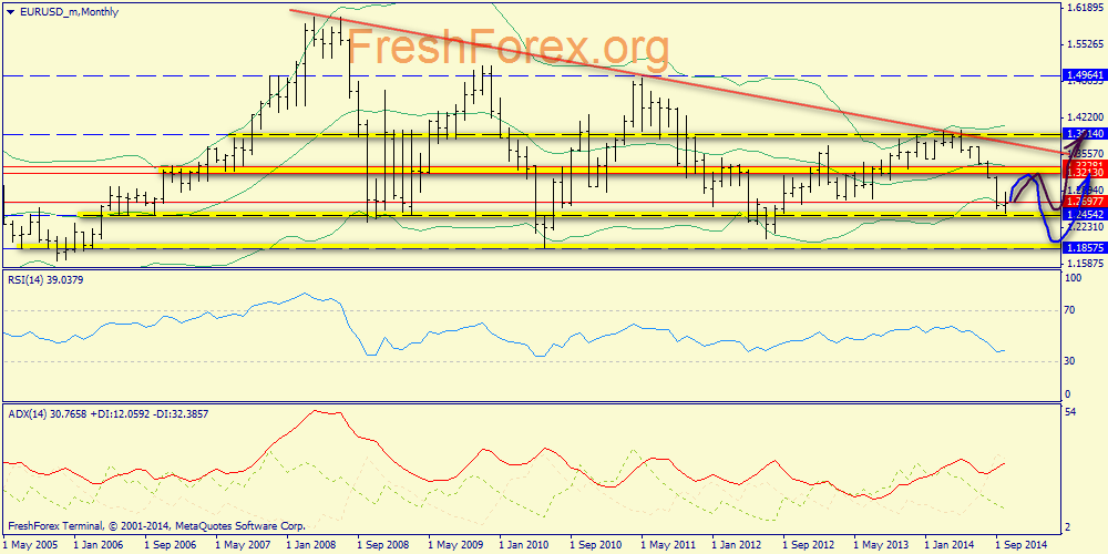 Месячный график: как видим, оправдывает себя сигнал на падение нефти (пробой нижнего конверта Боллинджера), который мы обсуждали в прямом эфире в начале месяца на конференции, посвященной 10-летию FreshForex. Причем (что страшно для быков) медведи двигаются на до сих пор неактивном ADX, что говорит о только лишь подготовке к основной фазе падения.