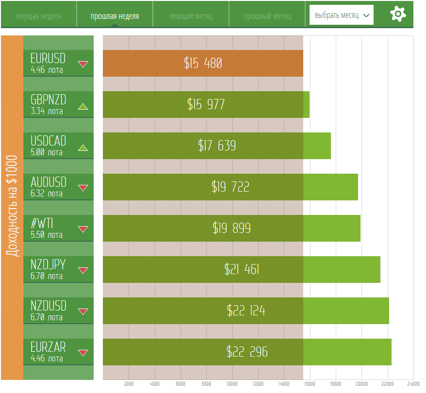 Мощный рост американского доллара на прошедшей недели отправил в нокаут нефть марки WTI – продажа 5.50 лотов увеличила бы ваш торговый депозит на 19 899$. Замыкает пятёрку неудачников недели пара AUD/USD:позиция Sell объемом 6.32 лота обогатила бы вас 19 722$. Австралийский доллар относится к числу сырьевых валют и слабость товарного рынка, которую мы наблюдаем последние 7 торговых месяцев по-прежнему оказывает давление на австралийца.