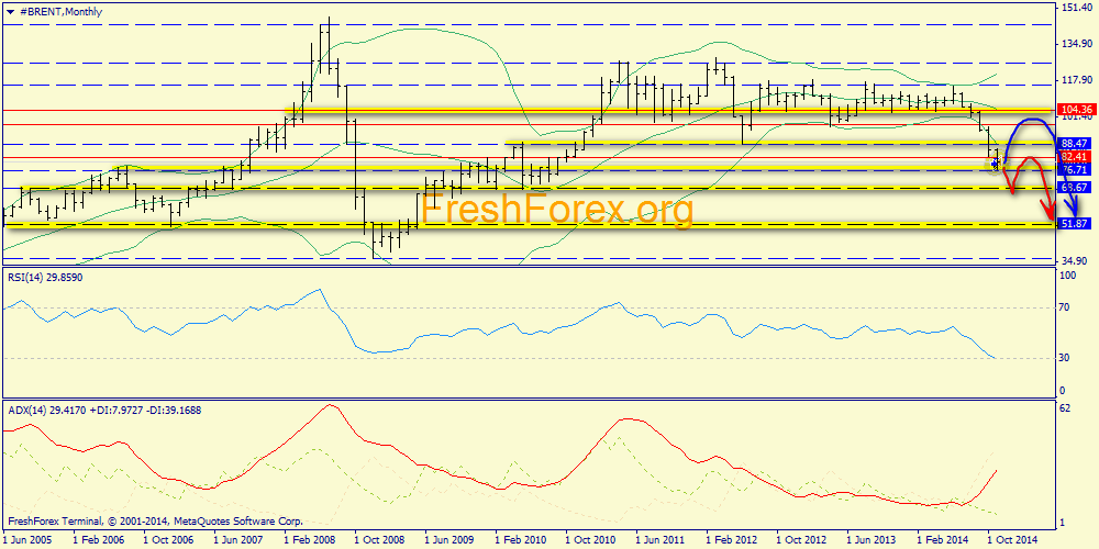 Недельный график: отмечаем так же косвенное ослабление быков - дивергенцию. Цель 2121.0 совсем близка, поэтому на этой неделе вполне могут появиться предпосылки для разворота вниз. Дневной график: сопротивление 2080.0 так же может создать сложности для роста. Поддержка аптренда расположена на 2020.0 (средняя полоса Боллинджера). Вывод: основной сценарий - прямой рост к 2121.0. Альтернатива - откат от 2080.0 к 2020.0 и затем доработка вверх к 2121.0 Нефть "Brent" Месячный график: итак, почти два месяца падения нефти после отмеченного нами еще в сентябре пробоя нижнего конверта. Достигнута пивот-зона 76.71, и мы видим, что ADX только сейчас приблизился к основному трендовому значению. Поэтому сценарии дальнейшего снижения и локального разворота вверх - равновероятны. Красной стрелкой обозначен вариант с продолжением вниз, с целями 68.67 и 51.87 (очевидно, что последняя цель достижима не за один месяц). Синяя стрелка описывает вариант, при котором быки отпустят нефть в коррекцию в район средней полосы Боллинджера (100.00-104.36), но при этом общий тренд вниз будет сохранен.