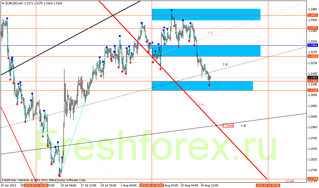 EURUSD Н4. При пробое 1.3115 цель восходящий угол 1:8 на уровне 1.2968, который развернёт пару минимум на коррекцию. Угол 1:4 пробит, теперь нужен его тест на уровне 1.3195.