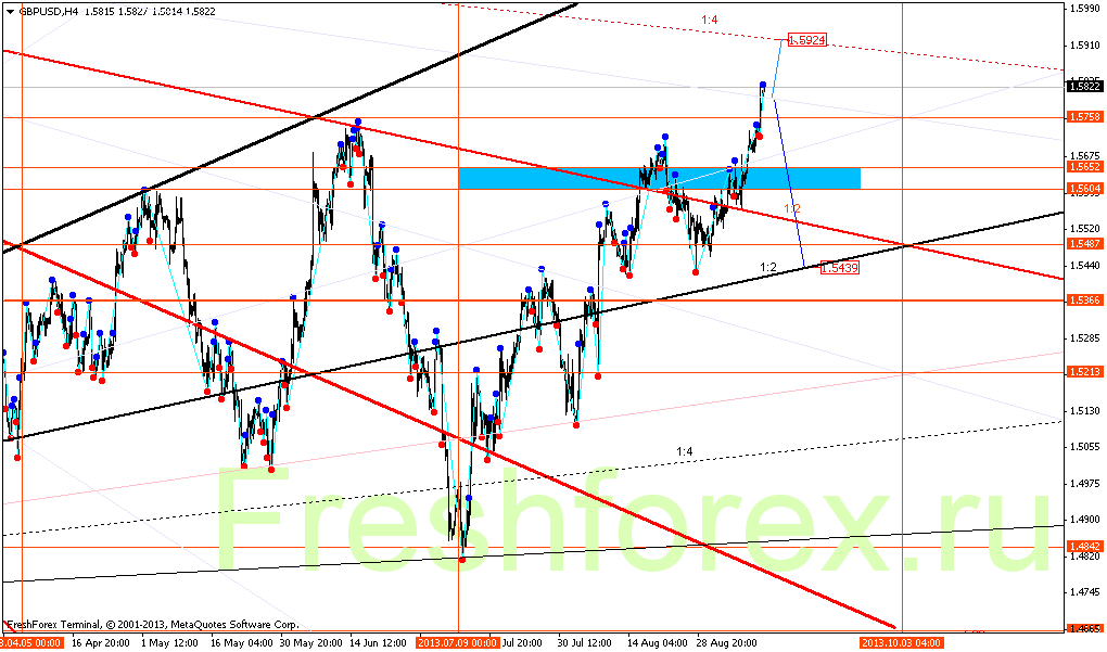 GBPUSD Н1. Цена пробила восходящий угол 1:2, после чего целью является зона покупок 1.5802 – 1.5876. При достижении этой зоны начнётся четырёхдневная коррекция к уровню 1.6056. При входе обратно в зону между двух углов 1:2 пара будет зажата в треугольник с границами 1.6127 – 1.5989. При пробое 1.5802 цель 1.5625.