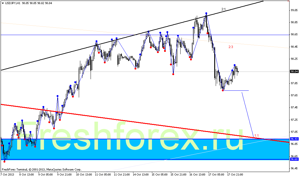 Н1. Цена в очередной раз подошла к нисходящему углу 1:3. Два варианта, это отскок к 98.39 и новый рывок вверх. И второй вариант это уверенный пробой 1:3 с первой целью 100.48. Цена слишком долго находится в зоне угла 1:3, что может привести к стремительному движению в любую из сторон.