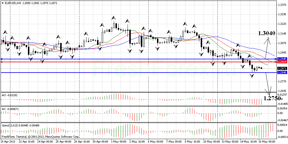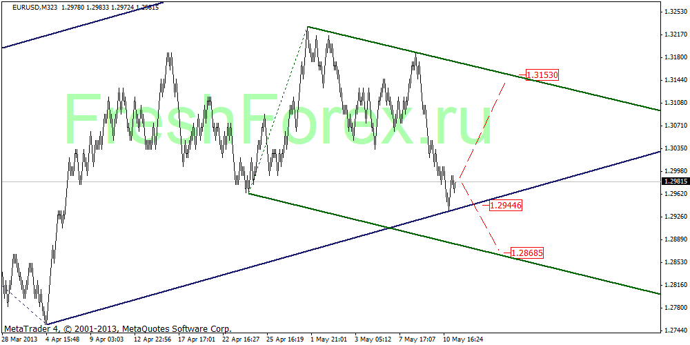Пара достигла нижней стенки синего канала. От этой стенки возможен отбой и движение вверх к уровню 1.315 - верхней границе зелёного канала. В случае пробоя уровня 1.294, снижение продолжится до нижней границы зелёного канала. Т.Е. наша задача в данном случае определить, какой канал является актуальным для цены в настоящий момент.