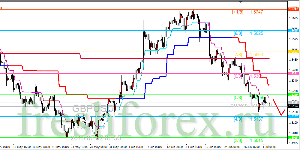 Четырехчасовой график GBPUSD. За последние сутки на графике существенных изменений не произошло. Цена по-прежнему находится в приделах бокового ценового канала (3/8 – 5/8). Напомню, что во время боковика границы канала (3/8) и (5/8), оказывают сильную поддержку/сопротивление, в то время как уровень (4/8), наоборот теряет свое влияние на цену. Выход из канала является прогностическим событием и определяет дальнейшие цели.