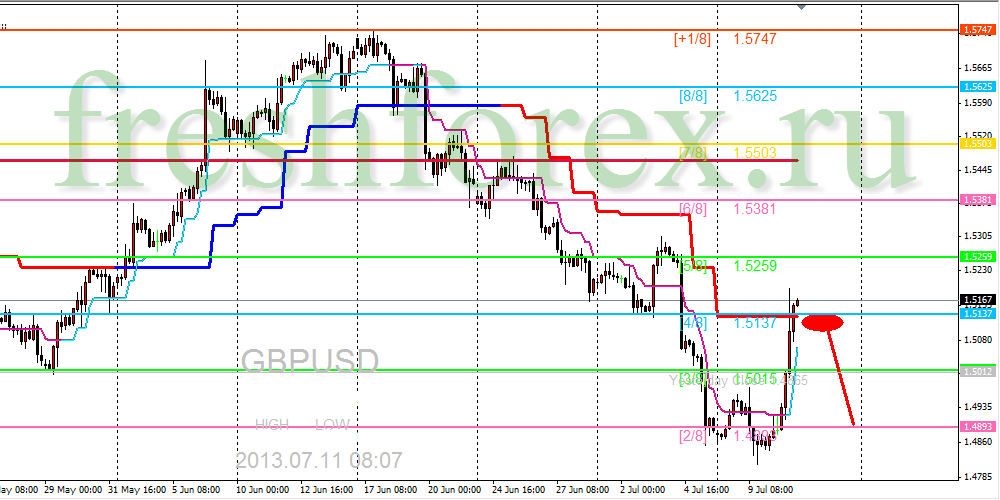 Четырехчасовой график GBPUSD. После ложного пробоя промежуточного уровня поддержки 1.4893 (2/8) цена вновь вернулась выше этой отметки и возобновила рост. На данный момент восходящее коррекционное движение достигла своей первой цели, в качестве которой выступает главный уровень поддержки/сопротивления 1.5137 (4/8), подкрепленный в добавок дневным СуперТрендом. С текущих позиций стоит ожидать возобновления нисходящего движения, но в данном случае стоит дождаться возврата цены под уровень (4/8) и закрепления её там. В противоположном случае рост продолжится с ближайшей целью на отметке 1.5381 (6/8).
