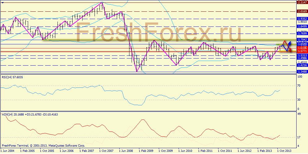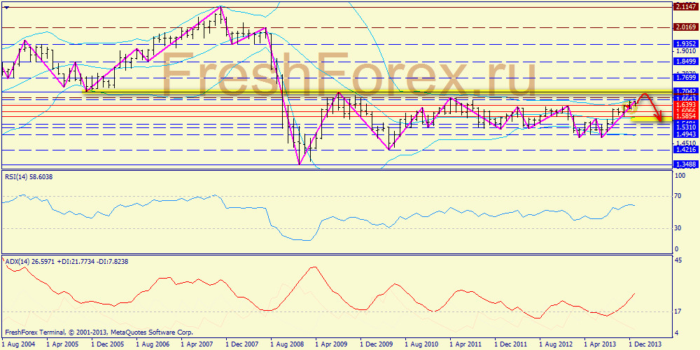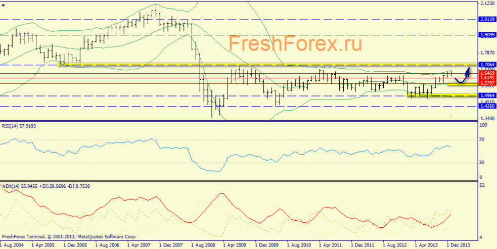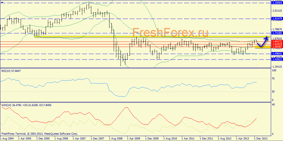 Месячный график: ADX, близок к трендовому значению, но, тем не менее, он еще не там. Конверты Боллинджера в горизонтальной плоскости, что увеличивает вероятность торговли в боковом коридоре. В целом актуальными выглядят уровни 1.5797 (поддержка от средней) и 1.7064 (пивот). Это значит, что на первом могут быть сформированы существеные сигналы в покупкам, а на втором - к продажам, соответственно.