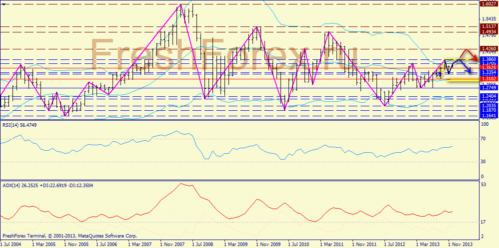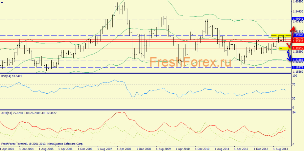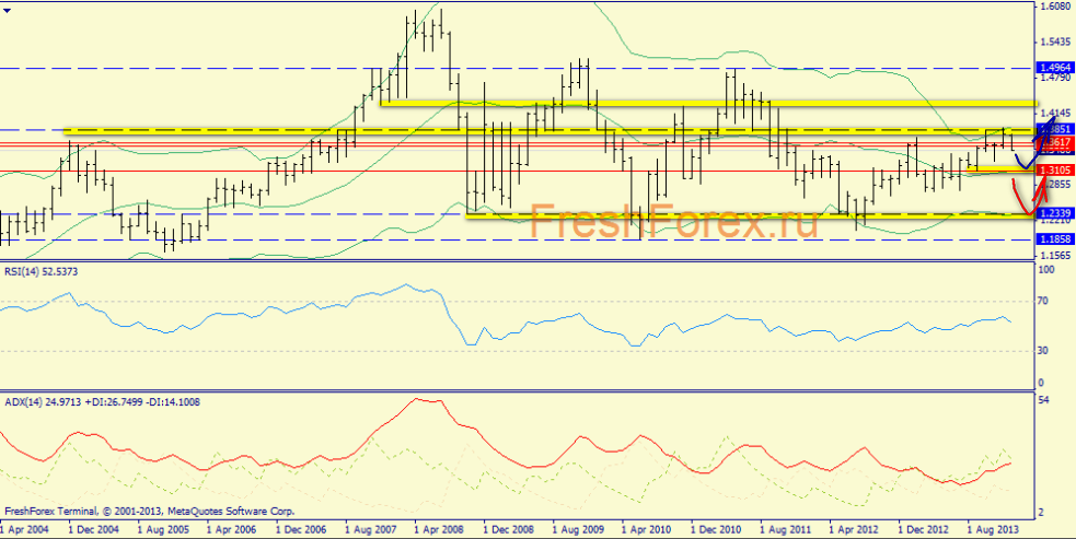 Месячный график: итак, быки соорудили себе пинбар, чем, казалось бы, обеспечили себе среднесрочные перспективы для роста к 1.4260. Однако основной наш обзорный индикатор (ADX) отвернулся вниз, что создает предпосылки к месячному откату вниз (либо к 50% пина в район 1.3440, или более глубокой коррекции в район средней Боллинджера (1.3106)). Подобный сценарий описан красной стрелкой.