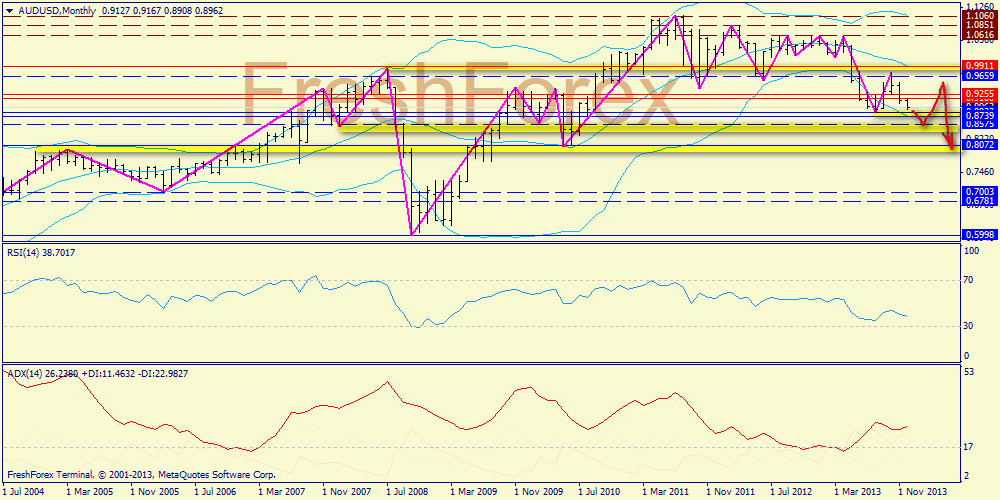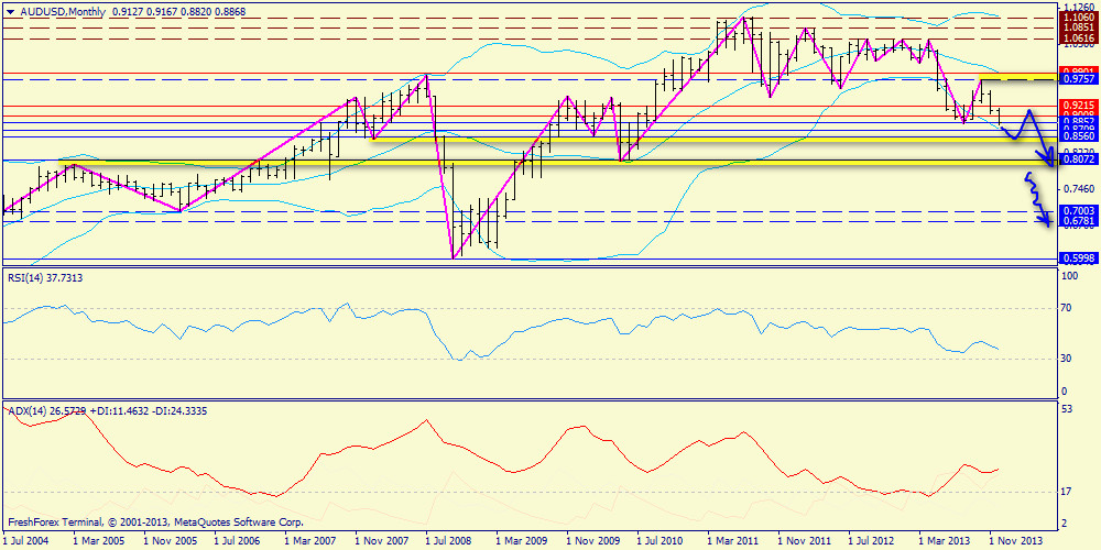 Месячный график: уверенный даунтренд с существенными по глубине возможного падения перспективами. Целями являются поддержки 0.8038 и даже 0.6959.