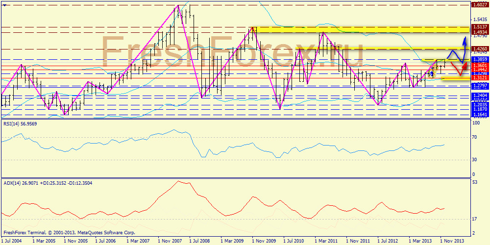 Месячный график: итак, месяц закрывается сильным бычьим аккордом, оформившем новый локальный максимум и вновь создав предпосылки к росту евро к 1.4260 в январе (и к 1.4934 в среднесрочной перспективе). Данные ожидания подкрепляются трендовой заинтересованностью от ADX.