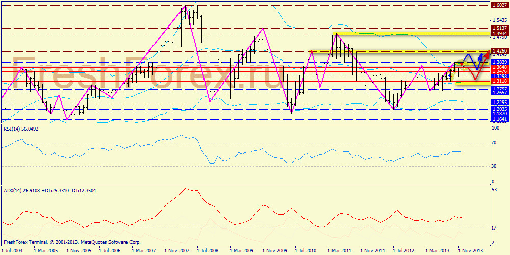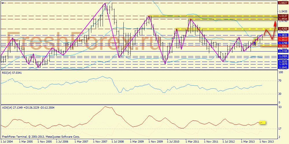 Недельный график: здесь так же видна роль сопротивления 1.3834: с его пробоем у быков почти не останется препятствий для роста к 1.4260. Поэтому необходимо учитывать возможность отката к средней полосе Боллинджера (1.3389), а с пробоем ниже - и к 1.3107.