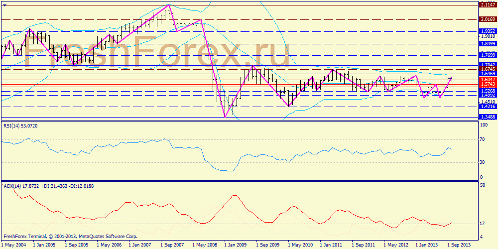 Недельный график: увренно возносящие в небо конверты Боллинджера не получают поддержку от ADX, поэтому, вероятно, в зоне 1.6240-1.63 могут быть вновь встречены активные продажи пары. Поддержки при этом ожидаются либо на средней полосе (1.5760), либо на пивоте 1.5267